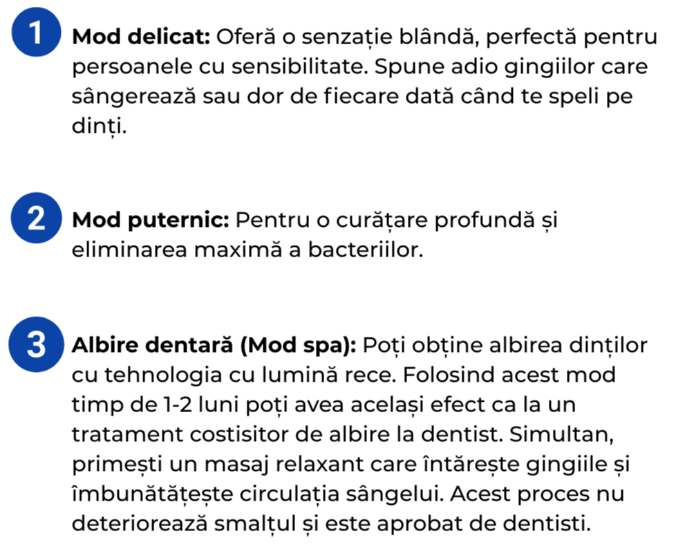 - Modul Puternic – Ideal pentru curățare profundă și îndepărtarea plăcii bacteriene.